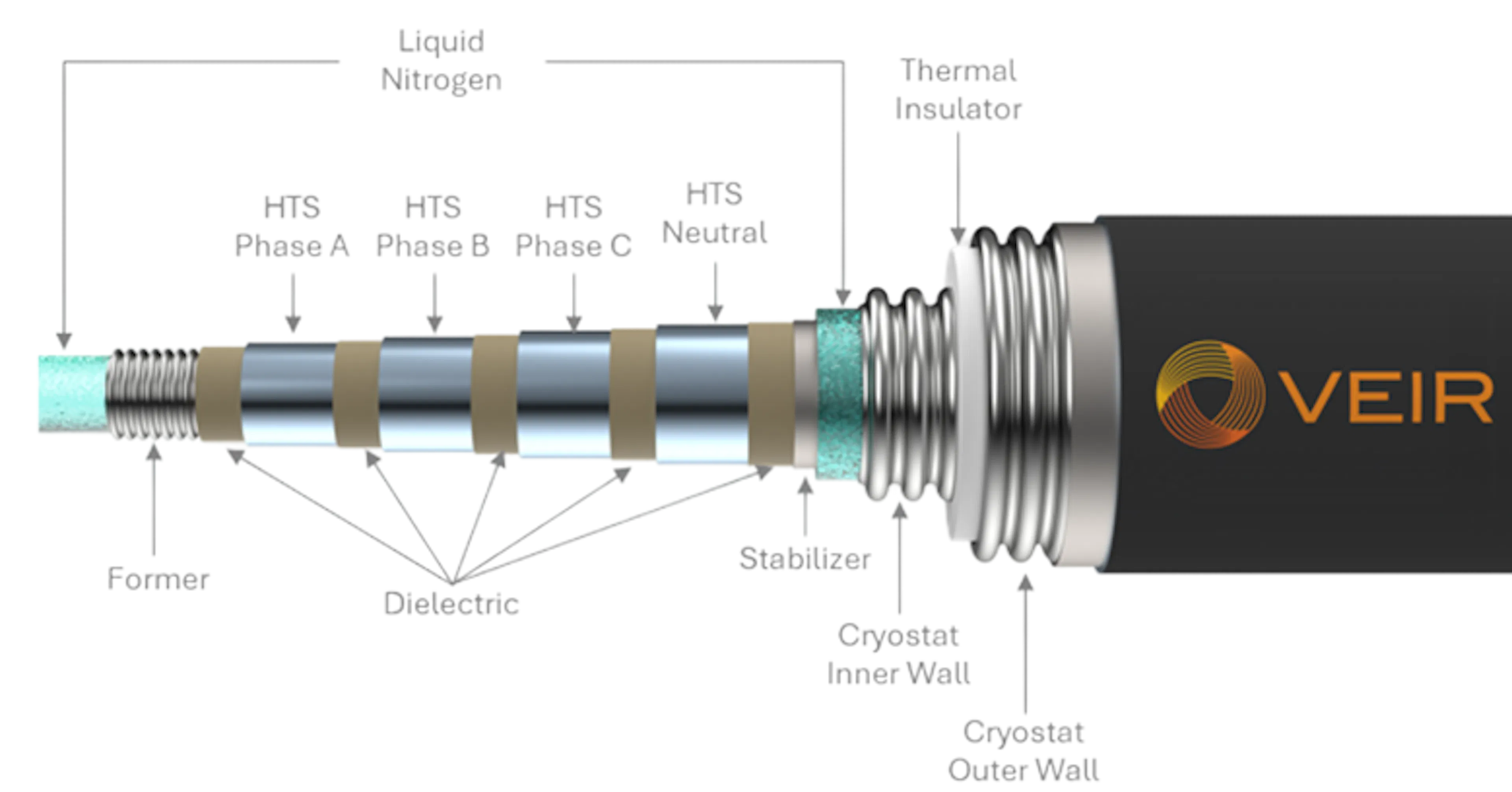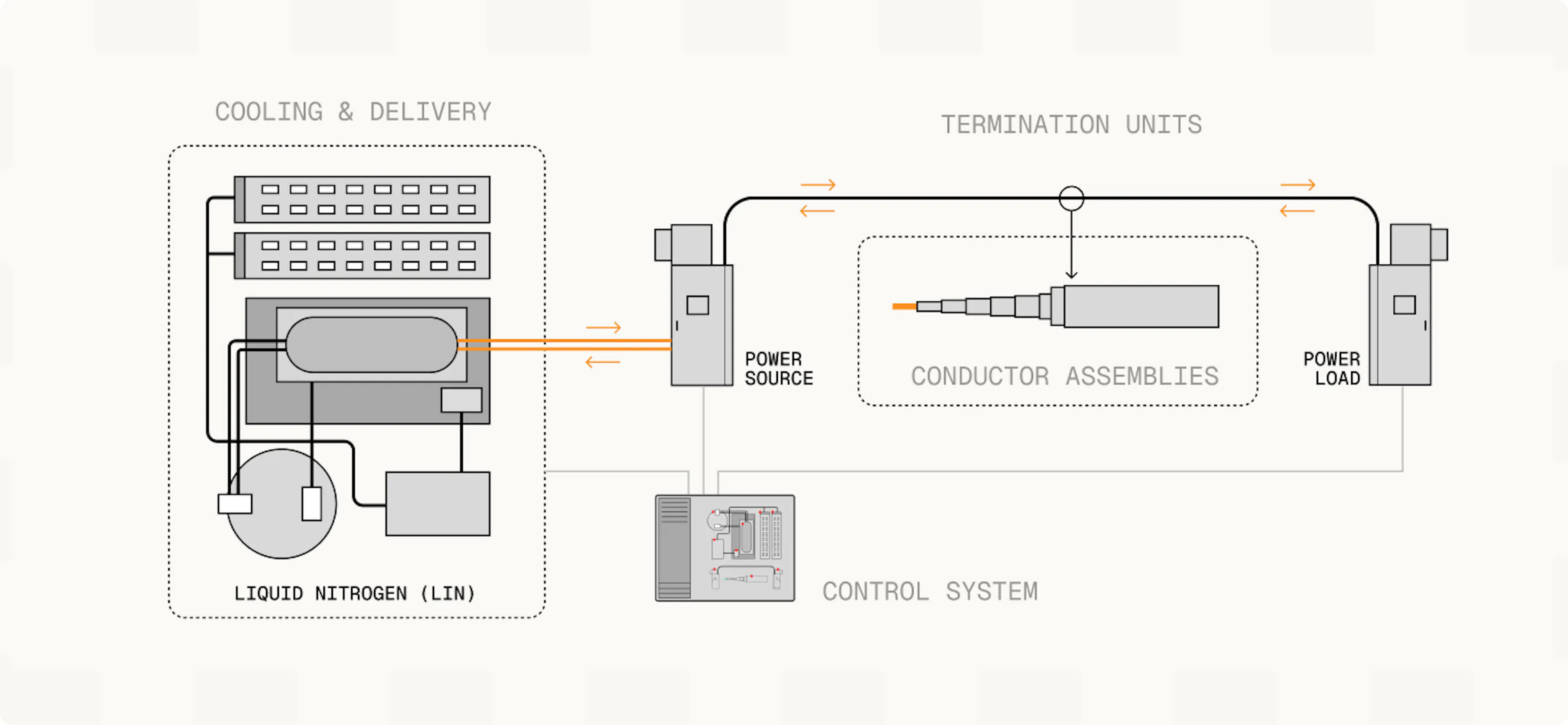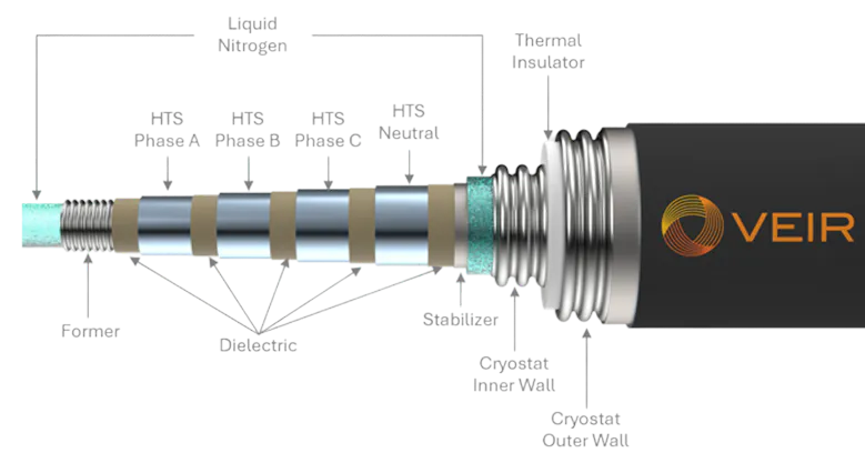 by limiting heat ingress. The core is designed for bi-directional flow of LIN so that cryogenic piping and controls are only required on one end of the system, allowing for streamlined terminations at the load in space-constrained white spaces. The unique layering of the high temperature superconducting (HTS) tape, dielectric and stabilizer layers balance current sharing, AC losses and mechanical flexibility.