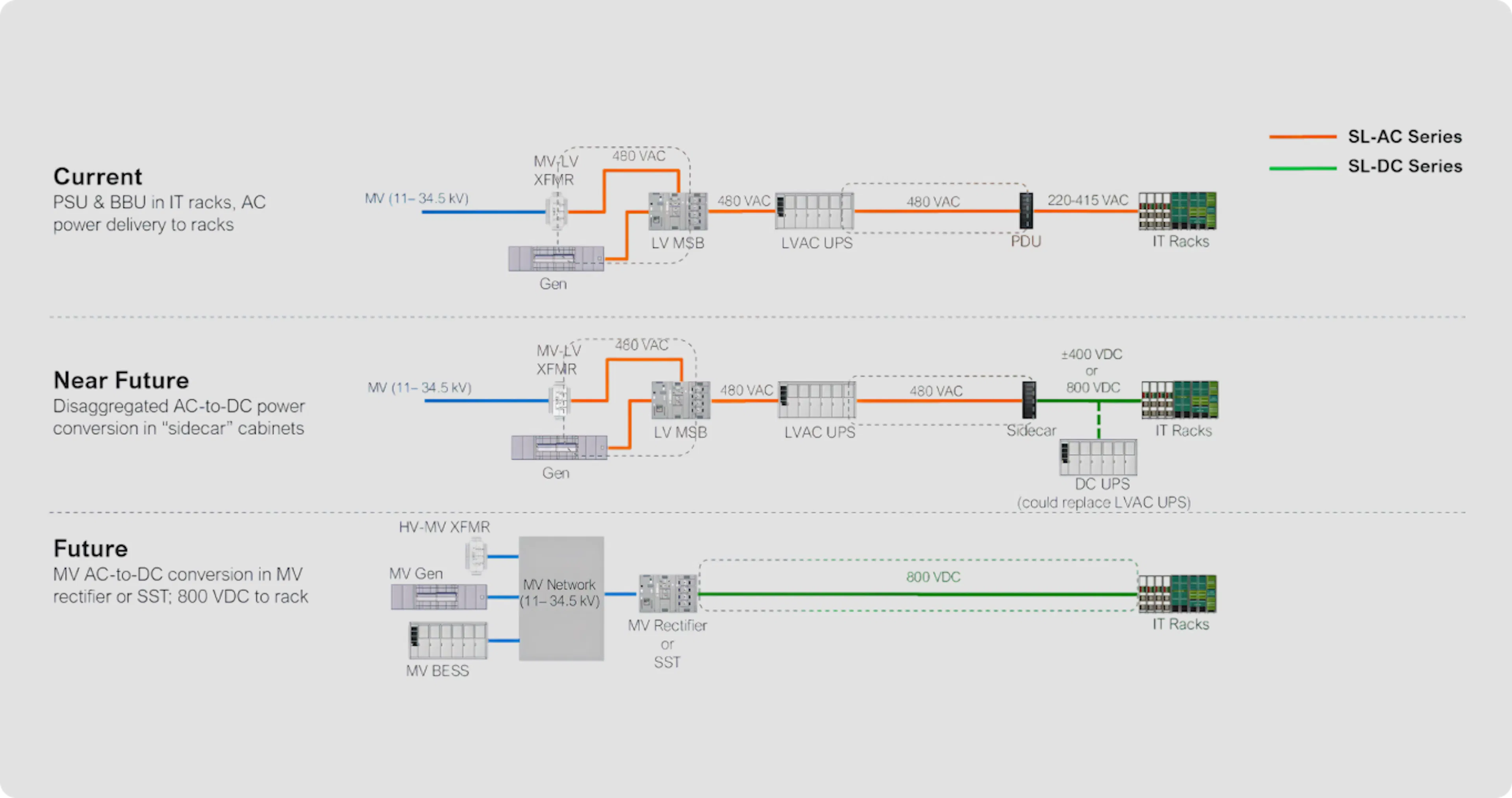 Rack power levels that historically ranged from 10 – 30 kW are now moving toward hundreds of kilowatts, with projections extending toward megawatt-class racks within the next few years. In order to support this dramatic increase in rack power density, data center architectures are slowly migrating away from the traditional AC power distribution to the rack to DC connected solutions.